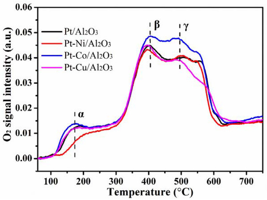 O2-TPD experiments were performed to understand their O2 desorption behavior, as shown in Figure 5. Three distinct desorption peaks could be seen on four catalysts, corresponding to different desorption oxygen species. The conversion process of oxygen adsorption on a catalyst was followed [35,36,37]: O2 (ads) → O2− (ads) → O2− (ads) → O2− (latt). Thus, it can be seen that these different states of oxygen on the surface of catalysts. Three distinct peaks were observed at about 170 ~ 210 °C, 400 ~ 420 °C, and 500 ~ 550 °C. A α strong peak in the range of 100 ~ 300 °C was regarded as the physically surface-adsorbed oxygen species and adsorbed O2− species (ads-O2 and ads-O2−, respectively) [36,38,39]. A β peak in between 300 and 450 °C was assigned to surface lattice species (latt-O2−), while the third peak (γ peak in between 450 and 600 °C) belongs to the pyrolysis of lattice oxygen at high temperature [40]. If the catalyst with α peak at a lower temperature level indicated that there could be more likely to produce surface oxygen species, which will provide higher catalytic activity. Generally speaking, a material with abundant reactive oxygen species can perform a redox reaction at lower temperatures, and the high-temperature oxygen fluidity can improve the efficiency of transporting oxygen species. As everyone knows that the oxidation process of VOCs mainly follows a Mars–van Krevelen mechanism and the reaction occurs due to a nucleophilic attack of surface absorbed oxygen species [41,42]. Meanwhile, the higher levels of surface active-oxygen species were conducive to VOCs oxidation [40,43,44,45]. Abundant surface oxygen vacancies could facilitate the formation of surface adsorbed oxygen species, which was verified by measuring the higher oxygen vacancy molar ratios of catalysts via XPS results in this study. Therefore, the strong desorption peak (α peak) of Pt-Co/Al2O3 suggests that more surface adsorption oxygen can be provided by the Pt-Co/Al2O3 catalyst, resulting in the catalytic performance of CO/toluene oxidation being improved significantly.