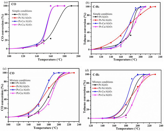 (a) CO and (b) toluene conversions in simple conditions of these Pt/Al2O3 and Pt-M/Al2O3 samples; (c) CO and (d) toluene conversion in mixture conditions of these Pt/Al2O3 and Pt-M/Al2O3 samples. Simple conditions: 1.0 vol.% CO or 1000 ppm toluene balanced with air; Mixture conditions: 1.0 vol.% CO and 1000 ppm toluene balanced with air. All the reactions were kept at WHSV = 60,000 mL g−1 h−1.