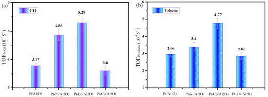 Figure 6 shows the catalytic activities for CO/toluene of Pt-based samples under different reaction conditions as a function of temperature, while the CO/toluene conversion plots were recorded at the heat preservation stage for 1.0 h. CO2 and H2O were the main products, while other by-products (below 1.0 ppm) were not detected. The catalytic activities of these samples were compared by using T10, T50, and T99 (the catalytic temperatures of 10%, 50%, and 99% CO/toluene conversion, respectively) as a reference, as described in Table 3. It can be found that all the catalysts have more outstanding catalytic activities than Pt/Al2O3 (T99 = 180 °C) for individual CO oxidation in Figure 6a, their T99 values for CO oxidation were achieved at 160 °C with a WHSV of 60,000 mL g−1 h−1. For individual toluene oxidation, Pt-Co/Al2O3 catalyst exhibited an optimal catalytic activity among these Pt-based catalysts in Figure 6b, its T10, T50, T99 are 160, 180, and 195 °C, respectively. However, the catalytic performance of bimetallic Pt-Ni/Al2O3 and Pt-Cu/Al2O3 catalysts for toluene oxidation was reduced, compared with the Pt/Al2O3 catalyst. However, when CO and toluene gases simultaneously exist in the reaction gases stream, the catalytic activities for CO and toluene oxidation over all the catalysts were inhibited due to the competitive adsorption of CO and toluene on the same active sites, as shown in Figure 6c and d. In addition, it can be found that there was an inverse hysteresis in CO or toluene conversion during catalytic oxidation over Pt-Co/Al2O3 catalyst in Figure S2, which was due to exothermic combustion. The Pt/Al2O3 catalyst exhibited complete oxidation for CO and toluene co-existence at 200 °C. Among bimetallic Pt-M/Al2O3 catalysts, Pt-Co/Al2O3 catalyst exhibited a more excellent catalytic activity for CO and toluene oxidation in mixture conditions, while Pt-Ni/Al2O3 and Pt-Cu/Al2O3 catalysts displayed a poorer CO and toluene oxidation activity than the Pt/Al2O3 catalyst. The presence of toluene caused an obvious decrease in CO conversion due to competitive adsorption of both CO and toluene on the surface of catalysts. Moreover, Platinum atoms exposed on the surface of catalytic materials were often considered as the active site for controlling the catalytic oxidation of CO/toluene. The TOF values for CO/toluene co-oxidation at 190 °C have also been calculated in Figure 7. With the increased dispersity of Pt in bimetallic catalysts, the Pt-based catalysts would effectively increase the catalytic activity and TOF of each active site. Therefore, the Pt-Co/Al2O3 catalyst with the highest dispersity and TOF value exhibited the best catalytic performances for CO/toluene oxidation at a lower temperature.