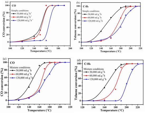 The effect of WHSV on the catalytic activities of Pt-Co/Al2O3 catalyst for CO/toluene oxidation was further investigated, as shown in Figure 8. With the increase in WHSV values, the catalytic activities of CO/toluene oxidation decreased. Under the condition of WHSV = 30,000 mL g−1 h−1, the temperature of complete oxidation for individual CO and toluene oxidation could be obtained at a temperature of 160 and 190 °C, respectively, whereas the T99 values for CO and toluene oxidation in mixture conditions were about 170 and 190 °C, respectively. When the WHSV value was further increased to 120,000 mL g−1 h−1, the Pt-Co/Al2O3 catalyst can completely degrade the CO and toluene at below 220 °C.