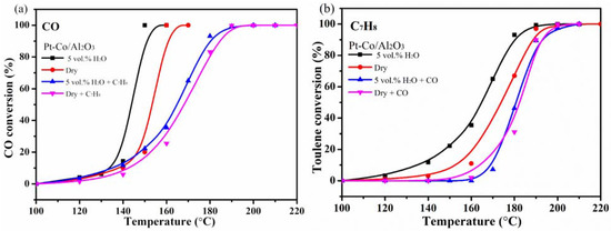 To simulate more realistic conditions, certain moisture was introduced into the simulated off-gas stream, which could obviously affect the catalytic performance of catalyst. The influence of moisture on the catalytic activities of the Pt-Co/Al2O3 catalyst for CO/toluene oxidation are showed in Figure 9. Surprisingly, it can be found that H2O promotes the catalytic activities for CO/toluene oxidation over the Pt-Co/Al2O3 catalyst. In addition, the promoting effect of H2O in individual CO/toluene oxidation is more remarkable than that in CO and toluene co-oxidation. For individual CO/toluene oxidation with moisture, Pt-Co/Al2O3 catalyst maintains full CO and toluene conversions at a temperature of 150 °C and 190 °C, respectively. Under the mixture conditions with moisture, the CO and toluene conversions would be mildly facilitated by moisture. Therefore, it can be seen from the experimental data that the Pt-Co/Al2O3 catalyst owns an excellent tolerance to H2O in the oxidation process, and H2O also have a similar promoting effect on other catalysts [44,46,47,48].