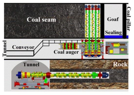 Thin coal seams, which are indispensable coal resources, are widely distributed around the world. The question of how to exploit these coal seams with high efficiency and mechanization has become the main development direction of coal excavation. The coal auger is a new type of thin seam mining equipment that has extensive prospects thanks to its characteristics of unmanned and non-supported coal face mining. Recently, a new type of coal auger working mechanism with five bits was used for further improving coal mining efficiency [1,2]. The drilling technology is shown in Figure 1. However, owing to the constraint reaction force of the coal wall, gravity, cutting resistance, and friction, the vibration of the working mechanism is relatively excessive, which may cause serious drilling deflection [3]. As a result, the efficiency of drilling and excavating is unbalanced. However, the excavation process has realized intelligent and rapid driving, based on supporting design optimization [4,5] and intelligent control [6].