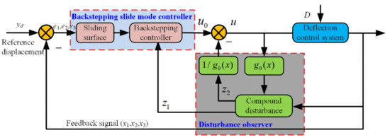 Position control systems based on the adaptive control method have been widely studied. However, it is difficult to obtain the optimal value of the compensation parameters when the external parameters change too much. A novel control method combining adaptive backstepping sliding mode control and an extended state observer was proposed to solve the above problems. The framework of the nonlinear adaptive backstepping control based on the disturbance observer (ABSMC-DO) for the DCM is shown in Figure 4. The basic concept of ABSMC-DO is to regard the parameter uncertainty and external disturbance as a system compound disturbance. A disturbance observer was designed to estimate the system compound disturbance. A nonlinear adaptive backstepping controller was proposed to compensate for the system compound disturbance. The stability of the overall system with the proposed control algorithm can be proved using Lyapunov analysis. The upper bound of directional vibration can be obtained without any disturbance. Using ABSMC-DO, the upper bound of the compound disturbance, which can effectively reduce the chattering in the directional control process, cannot be obtained easily.
