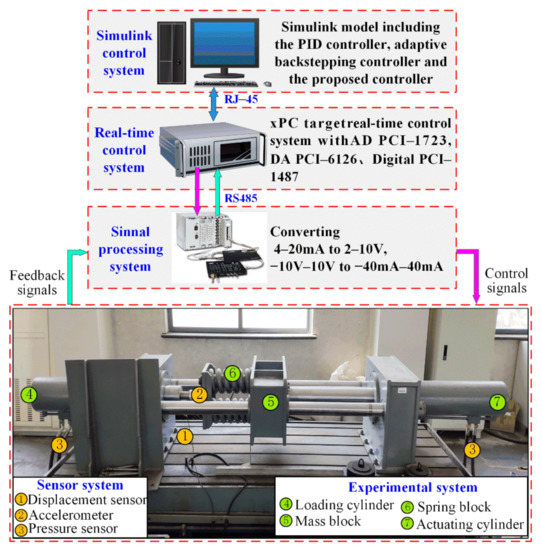 Figure 5 depicts an electro-hydraulic servo displacement control experimental system that is utilized to implement the proposed nonlinear adaptive backstepping control based on the disturbance observer (ABSMC-DO) designed in this paper and experiment on the deflection control testing system. The testing system is composed of a loading system and an actuating system. The loading hydraulic cylinder and actuating hydraulic cylinder are the actuators and are driven by the proportional servo valve (MA-DLHZO-TES-PS-040) manufactured by the YWL VTOZ company. The MTS magnetostrictive displacement sensor (RPS0500MD601V810050) with an accuracy of 0.1 mm is used to measure the hydraulic cylinder position. For measuring the pressure changes in real time, two pressure sensors (Mik-p300 and 0–20 Mpa, resolution ±0.5%) are installed on the oil inlet and outlet of the loading cylinder and actuating cylinder. All the executive elements and acquisition elements have relative control precision to realize industrial application. Different external loading signals, such as waves and sinusoidal steps, are imposed to the actuating cylinder. A tension pressure sensor is employed to measure the external loading with a repetitive accuracy of 0.05% FS (Full Scales).