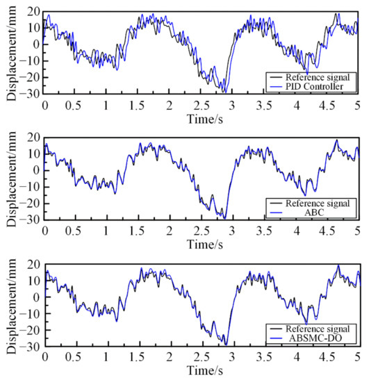 As we can see, the signal output waveform showed obvious distortion and phase lag with the conventional PID controller, whose amplitude deviation was the largest. Using the ABC and the proposed ABSMC-DO controller, the tracking effect improved significantly, which indicates that the nonlinear control effect was better in terms of its high response speed and high tracking accuracy.