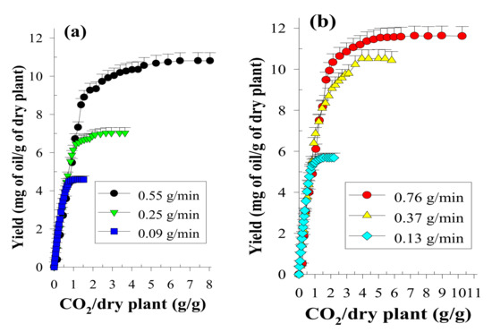 Overall extraction curves at 32 °C, 33.0 MPa and various CO2 flow rates (a,b) for the SCCO2 extraction of volatile oils from P. frutescens leaves.