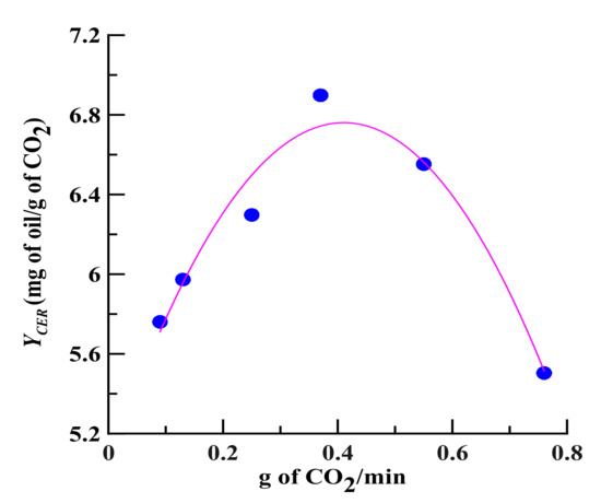 The effect of CO2 flow rate on YCER (mg of oil/g of CO2) value at 32 °C. The slope of the constant extraction rate (CER) period (a straight line) is defined as the YCER value, which is obtained by dividing the yield by the solvent/plant weight ratio. If the solvent is saturated with the solute, YCER should be maximized; this value is called the theoretical solubility (YCER*).