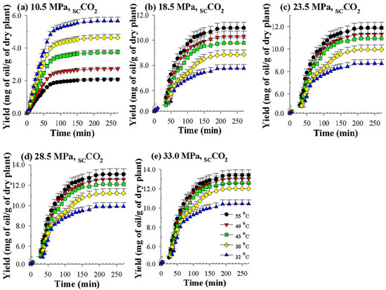 As shown in Figure 3, the effect of temperature obviously has two opposing trends on the yields obtained by SCCO2 extraction at different pressures. Under the lower pressure of 10.5 MPa (Figure 3a), because it is closer to the critical pressure of CO2 (7.39 MPa), when the extraction temperature increases from 32 °C to 55 °C, the density of supercritical CO2 drops substantially, so the SCCO2 extraction capacity is reduced. However, under the four higher pressures (18.5, 23.5, 28.5, and 33.0 MPa) (Figure 3b–e), the extraction temperature obviously increases (32 °C to 55 °C), which is conducive to an increase in the extraction yield.
