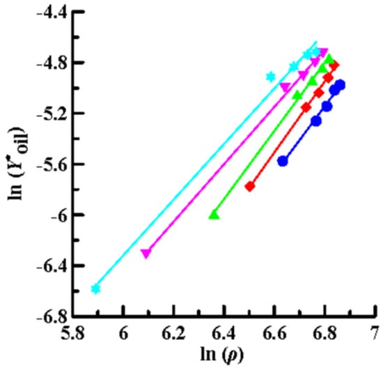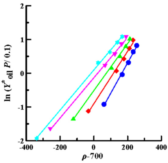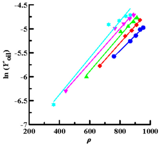 Plots of ln (Y*oil P/0.1) versus (ρ–700) using the Bartle model for oil extraction from P. frutescens leaves at various temperatures and pressures of 10.5–33.0 MPa. (●:32 °C; ◆: 38 °C; ▲: 43 °C; ▼: 49 °C; ★: 55 °C).