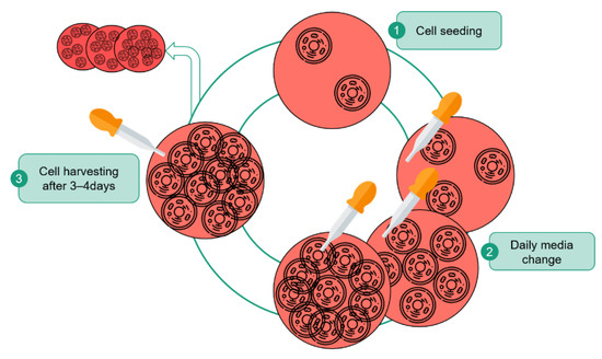 The process shown comprises three different steps, which are repeated over and over again. The cells of a certain density (number of cells/mL) are seeded into a cell culture vessel (1). Through cell division, the cells multiply exponentially and consume the nutrients from the medium through metabolic processes. When handling iPSC cultivations, a major concern is the maintenance of pluripotency, as this is highly sensitive to the cultivation conditions, such as media composition, growth surface and high cell densities [19,20]. To avoid accumulation of waste products and replenish growth factors such as basic fibroblast growth factor (bFGF) or transforming growth factor beta (TGF-β) to maintain pluripotency, the medium is exchanged regularly (2) [21]. If the cells become confluent, meaning they have colonized the available surface to a large extent, the growth rate is reduced. To avoid this and to maintain pluripotency, the cells are harvested and then reseeded (3). Different ratios can be chosen for the new seeding process, which is called splitting ration. Each of these three procedures requires numerous steps to be performed, increasing the amount of manual effort involved in cell cultivation. For instance, harvesting includes dissociation of the cells, interruption of dissociation and centrifugation, discarding of the supernatant, resuspension of the cells, determining cell number and then reseeding.