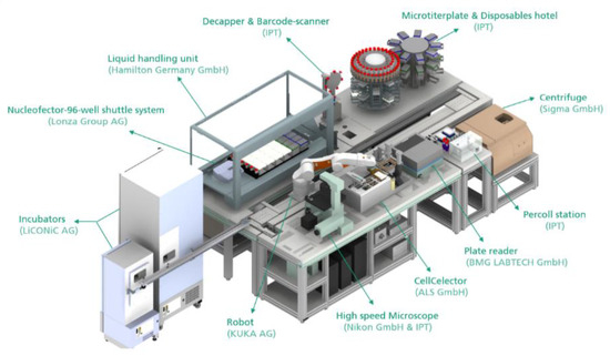 - Elanzew, A.; Nießing, B.; Langendoerfer, D.; Rippel, O.; Piotrowski, T.; Schenk, F.; Kulik, M.; Peitz, M.; Breitkreuz, Y.; Jung, S. The StemCellFactory: A modular system integration for automated generation and expansion of human induced plu-ripotent stem cells. Front. Bioeng. Biotechnol. 2020, 8, 1155. [Google Scholar] [CrossRef] [PubMed]