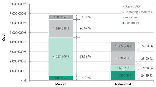 After calculating the costs and assuming the same revenue for both manual and automated production, the profit of the processes is analyzed and compared. Figure 4 shows the results for both processes for a machine lifetime of 8 years.
