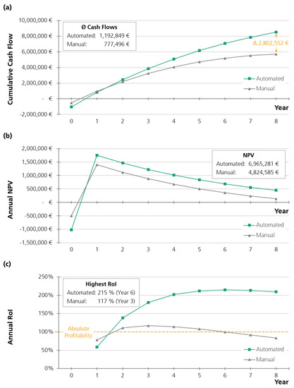 This is also represented by the NPV: After nine months, NPV of the automated process is higher than NPV of the manual process. The cumulated difference after eight years is nearly 2.2 M€ (Figure 4b).