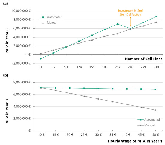 The produced and sold number of cell lines have a high influence on the profitability of the production process. In order to analyze this influence, NPV after 8 years was compared, assuming a constant number of produced cells over the lifetime of 8 years. The number of cell lines is varied based on the number of cell lines one MTA can produce per year (31 cell lines). This has different effects on the costs of automated and manual iPSC production. For the manual process, a production of 31 cell lines only requires one MTA and one clean bench. Assuming a 2-shift-production, for 62 cell lines, only one other MTA is required. The production of 93 cell lines requires a third MTA as well as a second clean bench, and so on. This shows that the cost of the manual production process varies a lot with the number of cell lines, as the OPEX (operating expenditure) is a lot higher than the CAPEX (capital expenditure) (see Figure 3). Considering the automated iPSC production, the dependence of cost from the number of produced cell lines is comparably low, as nearly two thirds of the cost are investment cost, and there is depreciation of personnel costs to install and maintain the factory. These costs would not reduce in case of a decrease in produced cell lines. Figure 5a shows the influence of the produced number of cell lines on the profitability of both manual and automated production. The comparison shows that automated production is more profitable when 100 cell lines are produced per year, so around 50% of the best-case-scenario. From this point on, automated production is more profitable than manual production. Even in case of a second SCF (over 213 cells per year), the automation would be more profitable. As already mentioned in the Introduction, the need for cell lines is increasing. Thus, this analysis again shows the value of automated production.