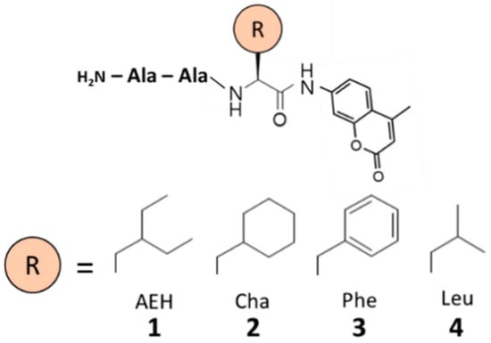 To compare the effects of the side-chain structures of the amino acid residues, a simple and easy sequence, H2N-Ala-Ala-XXX-AMC, was adopted for the design of the peptide substrates. Where XXX is either AEH 1, Cha 2, Phe 3, or Leu 4 (Figure 1). The tripeptides were designed with two alanine (Ala) residues to improve the binding to chymotrypsin without interfering with the effects of the residues under investigation (XXX).