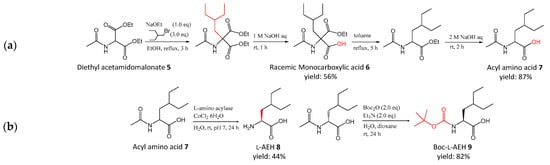 The synthesis of the unnatural amino acid, 2-amino-4-ethylhexanoic acid (AEH). (a) Synthetic scheme for the backbone of racemic AEH. (b) Optical resolution of the acyl-AEH racemic mixture and synthesis of Boc-L-AEH.