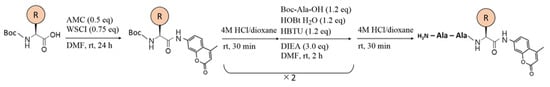 Boc-Leu-OH, Boc-Phe-OH, and Boc-Cha-OH were purchased from Watanabe Chemical Industries, Ltd., Hiroshima, Japan. The four Boc-amino acids, Boc-Leu-OH, Boc-Phe-OH, Boc-Cha-OH, and Boc-AEH-OH, were each reacted with water soluble carbodiimide hydrochloride (WSC HCl, 0.5 eq.) as a condensing agent in 8 mL of N,N-dimethylformamide (DMF) in an ice bath for 4 h (Figure 3). Then, these compounds were each reacted with AMC (0.5 eq.) for 20 h. In addition, each compound was reacted with WSC HCl (0.25 eq.) overnight. After the reaction, each mixture was evaporated under reduced pressure and then dissolved in ethyl acetate. These solutions were washed using 10% citric acid aqueous solution (twice), brine, 4% NaHCO3 aqueous solution (twice), and brine. Each organic layer was dried over MgSO4 and the solvent was evaporated under reduced pressure. The products were obtained as Boc-XXX-AMC. Peptide synthesis was performed by standard Boc liquid-phase synthesis. The products prepared above were each stirred in 15 mL of 4 M HCl/dioxane at room temperature for 30 min to remove the Boc group. The solvent was evaporated under reduced pressure and then the products H2N-XXX-AMC (XXX = AEH: 0.51 mmol, Cha: 0.78 mmol, Phe: 0.30 mmol, and Leu: 0.14 mmol) were obtained. These compounds were reacted with Boc-Ala-OH (1.2 eq.) using 1-hydroxybenzotriazole (HOBt, 1.2 eq.), 1-[bis(dimethylamino)methylene]-1H-benzotriazolium 3-oxide hexafluorophosphate (HBTU, 1.2 eq.), and N,N-diisopropylethylamine (DIEA, 3.0 eq.) for 2 h in 10 mL of DMF. After the reaction, each mixture was evaporated under reduced pressure and then dissolved in ethyl acetate. The solutions were washed using 10% citric acid aqueous solution (twice), brine, 4% NaHCO3 aqueous solution (twice), and brine. Each organic layer was dried over MgSO4 and the solvent was evaporated under reduced pressure. The crude products Boc-Ala-XXX-AMC were obtained. Subsequently, these products (XXX = AEH: 0.36 mmol, Cha: 0.72 mmol, Phe: 0.32 mmol, Leu: 0.21 mmol) were condensed with Boc-Ala-OH and then extracted as described above to give the products H2N-Ala-Ala-XXX-AMC 1–4. These products were purified using HPLC column with a gradient of acetonitrile/0.1% trifluoroacetic acid from 0 to 100% for 15 min at a flow rate of 2.0 mL min−1 and identified by mass spectrometry (Figure S1). The values of the mass analysis for each compound were as follows. XXX = AEH 1 m/z calcd. for [(M+Na)+] C24H34N4O5: 481.24269; found: 481.24294, Cha 2 m/z calcd. for [(M+Na)+] C25H34N4O5: 493.24269; found: 493.24139, Phe 3 m/z calcd. for [(M+Na)+] C25H28N4O5: 487.19574; found: 487.19662, Leu 4 m/z calcd. for [(M+Na)+] C22H30N4O5: 453.21139; found: 453.21194.