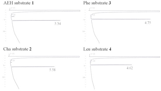 The hydrophobicity of the substrate affects the interaction with chymotrypsin because of the high hydrophobicity around the active site of chymotrypsin. To compare the interaction of the four synthesized peptide substrates with chymotrypsin, the hydrophobicity of each substrate was investigated (Figure 4). The relative hydrophobicity of the peptide substrates could be determined based on the retention times in the HPLC used for purification. The retention times increased depending on the hydrophobicity of peptide. Substrate 2 with the unnatural amino acid Cha had a retention time of 5.58 min and possessed the highest hydrophobicity. The peptide substrate with the synthesized AEH residue 1 had a retention time of 5.34 min and possessed the next highest hydrophobicity. The Phe substrate 3 and Leu substrate 4 had retention times of 4.75 and 4.62 min, respectively, indicating lower hydrophobicity than the Cha 2 and AEH 1 substrates. The presence of the π electrons in the Phe residue with an aromatic ring was thought to cause the lower hydrophobicity of substrate 3. In contrast, it was thought that the Cha 2 and AEH 1 substrates exhibited relatively higher hydrophobicity because of their aliphatic ring and branched chain structures, respectively.