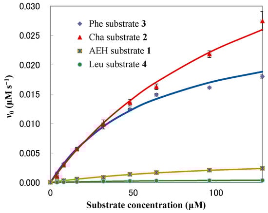 The specificity of chymotrypsin for the four peptide substrates was compared at various substrate concentrations. The activity of chymotrypsin toward the substrates was measured based on the fluorescence intensity of AMC resulting from the degradation of the substrate. The fluorescence intensity produced by the degradation increased over time for all the substrates. These results indicated that all the synthesized substrates can be recognized and degraded by chymotrypsin. The kinetics of all the synthesized substrates could be fitted to a Michaelis-Menten graph (Figure 5). To compare the preference of chymotrypsin for the synthesized substrates, the Vmax, Km, kcat, and kcat/Km values, which characterize the interaction between an enzyme and a substrate, were calculated based on the Michaelis-Menten equation (Table 1). The Cha substrate 2 showed the largest Vmax and kcat values, followed by the Phe substrate 3. These values broadly agreed with those previously reported for chymotrypsin under similar conditions [30]. In addition, the Vmax and kcat values were dependent on the hydrophobicity of the substrates, except for the Phe substrate 3. Because of the differences in these peptide substrates, the hydrophobicity and presence or absence of aromaticity may have affected the reaction velocity with chymotrypsin. The AEH substrate 1 showed approximately 6-fold lower Vmax and kcat values than the Phe substrate 3, despite showing a high hydrophobicity in the four peptide substrates. This result may be caused by the side chain of the AEH residue that has a high structural degree of freedom. Therefore, the reaction velocity of chymotrypsin for a substrate was affected by the hydrophobicity, aromaticity, and the side chain structure of the recognized amino acid residues.