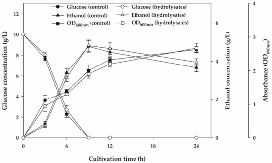 Figure 3 is shown the ethanol production profiling using S. angulatus hydrolysates (experimental group) by S. cerevisiae K35. In order to investigate the effect of fermentation inhibitory compounds that potentially exist in hydrolysates, glucose was used as the control group. The control and experimental group both showed the maximum ethanol production of 4.8 g/L at 9 h. Then, the ethanol yield of control and experimental group was 95.4% and 96.2%, respectively. The cell growth of the control and experimental group was similar, indicating that fermentation inhibitory compounds were negligibly produced during NaOH pretreatment. Kim et al. reported that the invasive plants, including S. angulatus, Ambrosia artemisiifolia and Eupatorium rugosum, have allelochemicals to survive in the ecosystem [47]. The allelochemicals such as flavonoids, terpenoids and organic acid have antibacterial activity [48,49,50,51]. In this study, the growth of S. cerevisiae K35 was not affected by the allelochemicals of S. angulatus. It is estimated that the allelochemicals contained in S. angulatus could be removed during pretreatment and washing stage. After 9 h of cultivation time, the initial 10 g/L glucose in both groups was almost consumed and the ethanol concentration decreased, while the cell growth increased. Several studies were reported that S. cerevisiae can utilize maltose, galactose and ethanol, which are less preferred carbon sources than glucose when glucose is depleted [52,53]. In the overall fermentation process, the control and experimental group showed similar levels of ethanol production, ethanol yield and cell growth. These results indicate that hydrolysates of S. angulatus are suitable to utilize as a carbon source replacing glucose in the ethanol production process.