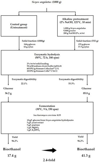 In this study, Sicyos angulatus was selected as the feedstock for bioethanol production, and NaOH pretreatment was performed to improve enzymatic hydrolysis. The GC and ED of the untreated S. angulatus (control group) were found to be 16.4% and 22.1%, respectively. The optimum NaOH concentration for alkaline pretreatment of S. angulatus was determined to be 2%. The GC and ED of S. angulatus pretreated with 2% (w/w) NaOH at 121 °C for 10 min (experimental group) were found to be 46.7% and 55.3%, respectively. It was found that NaOH pretreatment is suitable for glucose recovery from S. angulatus, showing 2.8-fold and 2.5-fold improved GC and ED, respectively, compared to the control group. Finally, the hydrolysates from S. angulatus were applied to a medium for bioethanol fermentation by Saccharomyces cerevisiae K35, and a high ethanol yield of 96% or more was achieved. In particular, since the hydrolysate did not show an inhibitory effect during fermentation, it was confirmed that it can be used as a useful resource for biorefinery. Currently, bioethanol production using agricultural raw materials is causing food ethics issues, and it is required to discover biomass that can replace agricultural raw materials for bioenergy production. This study suggested the possibility of using invasive plant such as S. angulatus at the present time when a lot of non-edible biomass sources is required for bioenergy production, and it is expected to be useful information for bioprocesses design in the future.