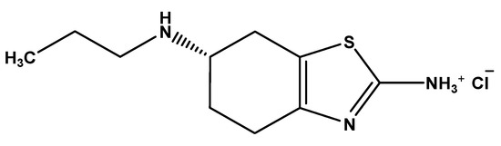 Pramipexole dihydrochloride is a pharmaceutical compound ((6S)–N6-propyl-4,5,6,7-tetrahydro-1,3-denzothiazole-2,6-diamine) and is an innovative and non-ergoline dopamine agonist. Primarily, this pharmaceutical compound was used against the idiopathic Parkinson’s disease symptoms [28,29,30], and also during research in Europe and the US, its usage was approved in adults for the treatment of the syndrome of idiopathic restless legs [31]. Consequently, due to its unique activity, it is widely used at a worldwide scale as a pharmaceutical compound. Moreover, it can be assumed that the use of this pharmaceutical compound will continue to develop and increase when the physicians of primary care become more familiar with its use. Some hospitals and industries that produce this pharmaceutical compound are discharging this pharmaceutical compound in their effluents, resulting in the final recipient being the natural resources of water. It is important to note that until now, no data is given in the literature for the detection of prami in water/wastewater. However, as described above, pramipexole has similar groups with other pharmaceutical compounds, so the study of its removal from aqueous systems can be a good tool for explanations. So, the treatment of wastewater that contains pramipexole is of great interest [28].