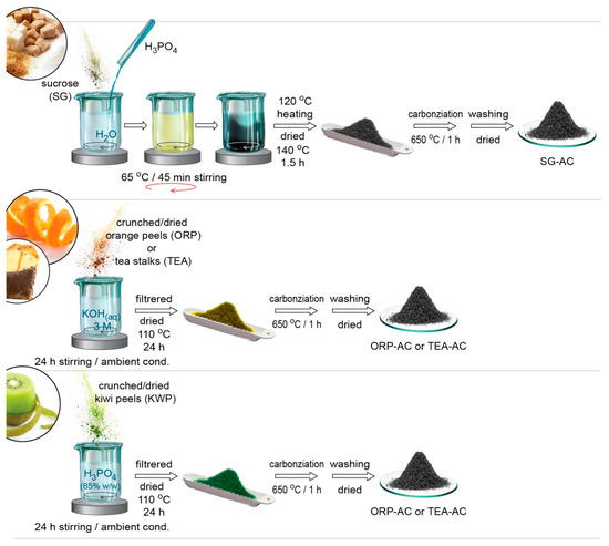 Activated carbon from tea stalks was prepared following the same synthetic protocol but using 10 g of tea stalks (TEA) as a precursor instead of orange peels, while the final obtained material is referred to as TEA-AC. For the kiwi peels-derived material, 10 g of dry KWP were treated as for ORP or TEA in order to obtain the dried and ground/powder biomass, which was dispersed in 125 mL of H3PO4 (85% w/w) for 24 h under vigorous stirring at ambient conditions, instead of a basic solution, with the rest of the steps being identical to those for ORP-AC. The kiwi peels-derived activated carbon is referred to as KWP-AC. A schematic illustration for the main steps of the synthetic protocols can be seen in Figure 2.