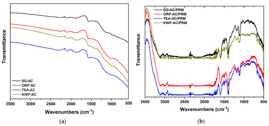 FTIR spectra of the prepared AC samples (a) before PRM adsorption and (b) after PRM adsorption.