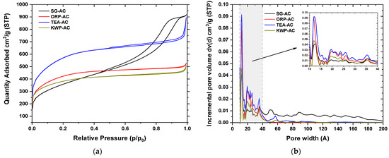 According to the classification of IUPAC, the adsorption isotherms for ORP-AC, TEA-AC, and KWP-AC revealed combined Type I isotherm characteristics at very low relative pressure p/p0 and Type II characteristics at high relative pressure p/p0, indicating the presence of micropores and mesopores at <2 and 2–50 nm, respectively. These results were also confirmed due to the presence of H3 and H4 desorption hysteresis loops, which associated with slit-shaped pores [32]. In contrast, SG-AC presented a Type IV isotherm [46,47,48] and presents a desorption hysteresis loop of Type H2(b), because its desorption branch is not too steep as in the case of H1 and H2(a) hysteresis loops. Such hysteresis loop results are mainly presented after hydrothermal treatment of certain mesoporous ordered silicas and mesocellular silica foams [49]. According to the classification of IUPAC, the Type IV isotherm is exhibited when a mixture of microporous and mesoporous material occurs. This indicates capillary condensation in the mesopores structure [50]. All the details about the textural parameters of the yielded AC samples are given in Table 2.