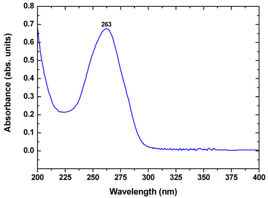 It is important to note that PRM was experimentally found to be stable and not hydrolyzed at this pH (3). The latter was found carrying out a hydrolysis experiment (10.00 mg/L of PRM in deionized water adjusted at pH = 3 with shaking at 25 °C for 24 h—given that this was the maximum contact time in adsorption); the concentration found was 9.86 mg/L, which means 1.4% as a hydrolysis percentage. Additionally, the scanning of the PRM in UV-Vis did not reveal any change in λmax (263 nm) (Figure 9).