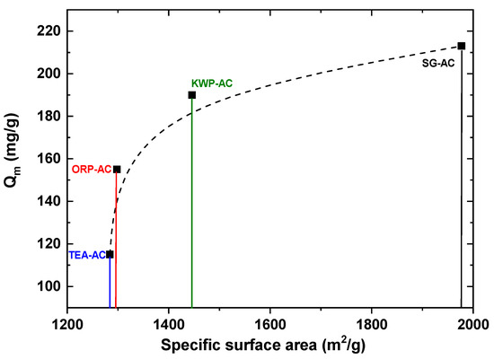 A direct comparison among the value of Qmax of various adsorbent materials cannot be objective due to the different parameters of the followed synthetic protocols (temperature, activation agent, cost of the precursor, etc.), and also mainly to the cost of synthesis. However, to obtain a first sense about the range of adsorption of the used AC samples, some examples are given in Table 5. As it can be observed, SG-AC has an excellent adsorption capacity when compared with other adsorbent materials, and more importantly compared to other carbonaceous materials obtained from biomass like potato peels or tea waste.