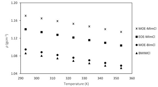 The density and viscosity measurements were carried out for all ether-functionalized ILs except for EOM-MImCl due to its solid appearance, which is not suitable for viscosity measurement. The experimental density values for ether-functionalized ILs and BMIMCl are given in Figure 2. In the ether-functionalized ILs family, the density of ILs reduced as the alky chain increased from methyl to butyl group. Similar cases were observed in tetraalkylammonium, trialkyl sulfonium and 1,2,3-dialkyimidazolium-based ILs [,]. The cation size becomes larger as the alkyl chain gets longer, thus leads to unfavorable packing in IL structure, which in turn contributes to the high-density of ether ILs []. To highlight the effect of ether in ILs density, a similar measurement was done for BMIMCl. According to Zhang and coworkers, the presence of ether in ILs alkyl chain had increased the density of ILs due to the better entanglement of the ether group caused by its flexibility [].