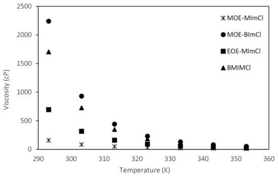 The dynamic viscosity of the synthesized ether-functionalized ILs and commercial BMIMCl as a comparison was carried out simultaneously with density measurement in the temperature range of 293.15 K to 353.15 K by using Anton Parr SVM 3000. The dynamic viscosities of ILs decreased exponentially with increasing temperature, as shown in Figure 4. The viscosity values decreased in the order of MOE-BImCl > BMIMCl > EOE-MImCl > MOE-MImCl. Generally, the viscosity of ether-functionalized ILs increased as the alky chain increased. To highlight the effect of the ether-functionalized group on the viscosity of ILs, a comparison was made between MOE-MImCl and BMIMCl, which contain a common ethyl chain in their structures. MOE-MImCl, which has an ether group, exhibited lower viscosity at all temperatures studied than that of BMIMCl. The existence of an oxygen atom with two lone pairs in the ILs alkyl chain causes an electron-donating effect that weakens the electrostatic interaction that exists between cation and anion and thus contributing to a reduction of MOE-MImCl viscosity [].