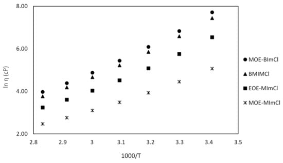 Figure 5 presents the Arrhenius plot of ILs dynamic viscosity, which were done according to Equation (6):
