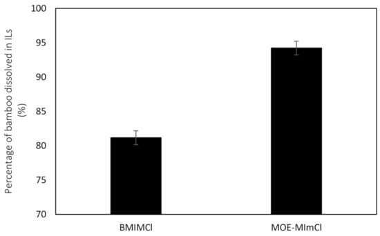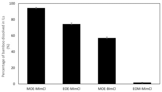 Generally, lignocellulosic biomass dissolution is a crucial step in the pretreatment process in order to extract its important constituents, namely cellulose, hemicellulose and lignin, which later can be converted into value-added chemicals. After a successful dissolution process, each constituent can be recovered by adding various solvents into the mixture containing dissolved lignocellulosic biomass and IL [,]. Nevertheless, this work is focusing on the improvement of the lignocellulosic biomass dissolution process utilizing ILs. In this work, the dissolution of bamboo was carried out in the synthesized ether-functionalized ILs to identify the best ether ILs for lignocellulosic biomass pretreatment. All parameters for the dissolution process were predetermined during previous studies []. Figure 6 shows the percentage of bamboo dissolved in all ILs. MOE-MImCl recorded the highest dissolution percentage, which is more than 90%, as compared to other ether-functionalized ILs. As shown in the viscosity data previously, MOE-MImCl recorded the lowest viscosity values. Besides promoting the high mass transfer of solute during dissolution, a low viscosity environment is also preferable for the sonication technique []. In a low viscous solution, the cavitation occurs rapidly to generate microbubbles that later burst and provide higher energy for breaking down the cell wall of lignocellulosic biomass []. This process enhances the amount of biomass dissolved in MOE-MImCl within a shorter period. The lowest dissolution percentage of bamboo was recorded in EOM-MImCl, which is less than 10%. EOM-MImCl exists in a solid state in which the ultrasonic waves were unable to be properly transmitted, thus causing an immediate reduction in power generated by ultrasonic.