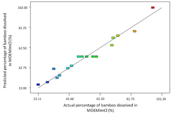 Actual vs. predicted plot for response surface methodology (RSM) of bamboo dissolution in MOE-MImCl.