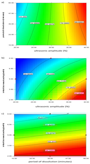 Contour plot for the effect of each parameter for bamboo dissolution in MOE-MImCl; (a) plot of period of dissolution against ultrasonic amplitude, (b) plot of initial biomass loading against ultrasonic amplitude and (c) plot of initial biomass loading against period of dissolution.