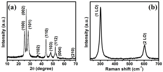 The phase purity and crystallographic structure of the as-synthesized CdS NRs catalyst were investigated by using the XRD technique. The XRD pattern of CdS NRs is shown in Figure 1a. The observed diffraction peaks at 2θ 25.06°, 26.67°, 28.40°, 36.96°, 43.92°, 48.10°, 52.23°, 54.94°, and 67.31° and were assigned to the (100), (002), (101), (102), (110), (103), (112), (004), and (210) crystal planes of the hexagonal CdS, respectively (ICCD, PDF, 00-001-0780). The sharp diffraction peaks indicate the higher crystallinity of the as-synthesized CdS photocatalyst. The XRD peak intensities of the CdS NRs differ from the bulk material. It is noted that XRD peak intensity at 26.67° corresponding to (002) facet of CdS, is much more intense with a small width than all the other peaks, indicating the orientation growth of the nanorods along the c-axis [35], in agreement with FESEM results. Moreover, the XRD pattern of the as-synthesized CdS NRs did not show any peaks except for CdS, which confirms the high purity of the catalyst. The crystalline phase, homogeneity, and surface condition of the CdS NRs was further confirmed by Raman spectroscopy, as shown in Figure 1b. The CdS shows two characteristic peaks at 300 and 603 cm−1 corresponded to the 1LO and 2LO vibrational modes, respectively. The sharp Raman peaks indicate the high crystallinity of the synthesized photocatalyst, which is consistent with the XRD observations.
