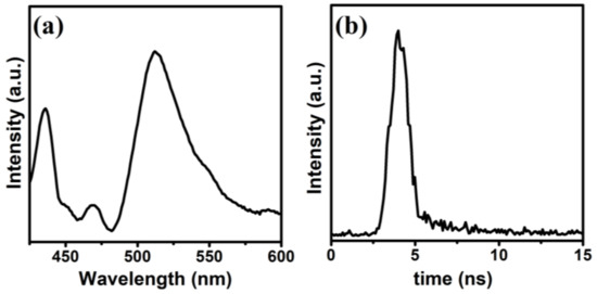 The photoluminescence (PL) measurements were performed using an excitation wavelength of 380 nm to investigate the lifetime and separation of photo-induced electron-hole pairs in CdS NRs. The PL spectrum was recorded in the 425–600 nm spectral range (Figure 5a). It is well known that there is a close link between the PL data and the recombination process of photo-generated electron-hole pairs of the photocatalyst. Generally, a higher value of PL peak intensity indicates the rapid recombination of the photo-generated electron-hole pairs of the catalyst, while a lower value indicates the higher separation of photo-generated electron-hole pairs [38]. The PL emission spectrum of CdS NRs exhibits a broad emission peak around 510 nm due to the near-band-edge emission, which is consistent with the UV-vis spectroscopy results. Time-resolved PL spectrum was captured to calculate the lifetime of the photo-generated electron-hole pairs of the photocatalyst; this was found to be 1.83 ns (Figure 5b) [39].