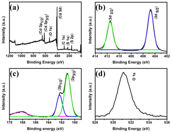 The valence state and surface chemical composition of the CdS NRs were determined via XPS analysis. The XPS survey spectrum given in Figure 6a, show the presence of Cd and S in the majority, together with trace amount of C and O, which are probably due to contamination and adsorbed oxygen during sample exposure to the air. The two strong peaks located at 404.2 and 411.2 eV (Figure 6b) corresponds to the Cd 3d5/2 and Cd 3d3/2 states of Cd2+, respectively [40]. The high-resolution S 2p spectrum in Figure 6c shows two strong peaks at 162.2 eV and 160.9 eV; and one weak peak at 168.3 eV. The strong peaks at 162.2 eV and 160.9 eV corresponds to the S 2p3/2 and S 2p1/2, respectively, which can be attributed to S2− ions, while the weak peak at 168.3 eV is due to the higher valence state of S, which came from the hydrolysis of sulfur source. Figure 6d shows the binding energy of the O 1s peak of the surface adsorbed oxygen atoms on CdS.
