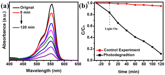 Time-dependent absorption spectra of RhB solution in visible light (a), and the degradation of RB in visible light (b).