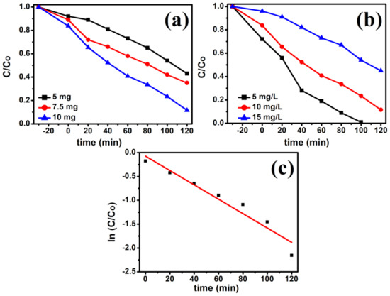 Effect of photocatalyst loading (a), Effect of initial RhB concentration (b), and Plot of ln (Co/C) vs. time (c) (10 mg photocatalyst, 10 mg/L RhB dye, Room temperature, 300 W incandescent lamp).
