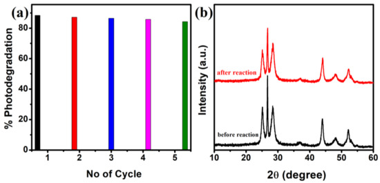 In addition, to study the photostability and reusability of the as-synthesized CdS NRs photocatalyst, an experiment of five consecutive cycles for the photodegradation of RhB dye was carried out. The photodegradation activity of the CdS NRs remained almost constant over five-cycles as shown in Figure 9a, suggests excellent cycling stability photocatalyst. The XRD pattern (Figure 9b) of the used photocatalyst after five cycles shows that no additional peak was observed and the crystal structure of the photocatalyst has been preserved, indicating the high stability and sustainability of the photocatalyst.