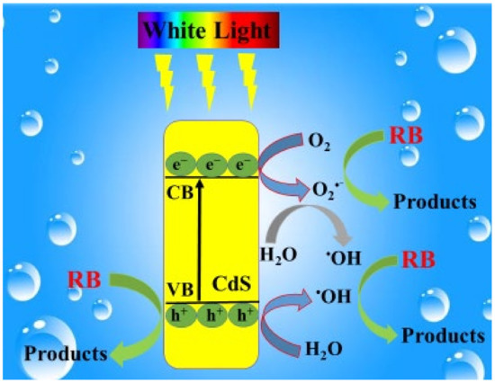 Figure 10, depicts the plausible mechanism for RhB dye degradation over CdS NRs. Upon visible light illumination, the electrons (ē) are excited from the filled valence band (VB) of CdS to the conduction band (CB), creating a hole (h+) in the VB. The generated electron from the conduction band is taken up by the adsorbed O2 at the surface of the photocatalyst and produces superoxide radical ion (•O2−). The •O2− further reacts with H2O and produces hydroxyl radical (•OH) or can directly oxidize RhB dye. Simultaneously, some of the photo-induced holes (h+) react with OH− or H2O to generate active specie •OH, which oxidize the adsorbed RhB dye.