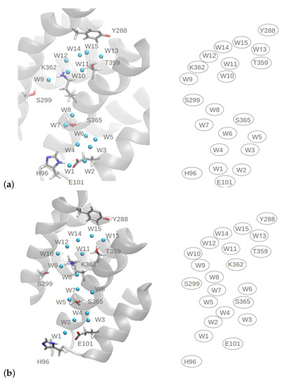 The “up” models show proton transfer starting from about the height of T359 and above is mainly in “downwards” direction, whereas paths starting just below K362 lead “upwards” (see Figure 11). This is also reflecting the directed hydrogen-bonded networks which point “down” from the protonated water molecules in models w13, w14, and w15 in the top part of the channel, and mainly up in models w9 and w10. If only the hydrogen-bonded connections in the source replicas are considered, paths starting at the lower end of the channel do reach up to the same lengths in the “up” models as observed in the “down” models, even though the protonated water molecules in those cases are located significantly more above E101 than in the “down” models. Implementing the stricter criterion of a hydrogen-bonded connection also in the target replica reduces the probability for long paths significantly in the “up” models. The paths starting above K362 reach lengths of six residues as opposed to more than 10 residues observed for the “down” models, in agreement with the disrupted hydrogen-bonded networks in the “up” models.