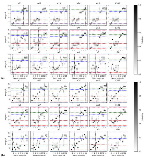 Occupancies of water positions, represented by their height in the K-channel. (a) Simulations of the reduced model based on a snapshot with K362 in an “up” position, (b) simulations of the reduced model based on a snapshot with K362 in a “down” position. The dashed horizontal lines represent the average height of the hydroxyl oxygen atom of Y288 (pink), the hydroxyl oxygen atom of T359 (green), the nitrogen atom of K362 (blue), the hydroxyl oxygen atom of S365 (brown), the CD atom of E101 (red), and the CE1 atom of H96 (cornflowerblue). The dashed black line marks the water molecule that is protonated in the respective simulation.