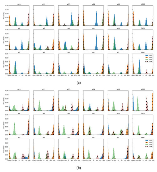 Distribution of side chain dihedral angles, ,,, and of residue K362 in the MD simulations with the excess proton located at different sites. (a) Simulations of the reduced model based on a snapshot with K362 in an “up” position, and (b) simulations of the reduced model based on a snapshot with K362 in a “down” position.