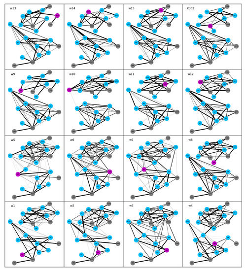 Undirected hydrogen bonded network computed from the MD simulations with the excess proton located at different residues, based on a snapshot with K362 in “up” position. The nodes of the network are the protein residues (in gray) Y288, T359, K362, S365, H96, or E101, and the fifteen water molecules (in blue) in the channel. The residue carrying the excess proton is highlighted in magenta. Edges of the network correspond to hydrogen bonds and are shown as lines. The thickness of the lines indicate the probability of the hydrogen bonds. Hydrogen-bonded networks of models with protonated H96 and E101, respectively, are shown in Supplementary Figure S3.