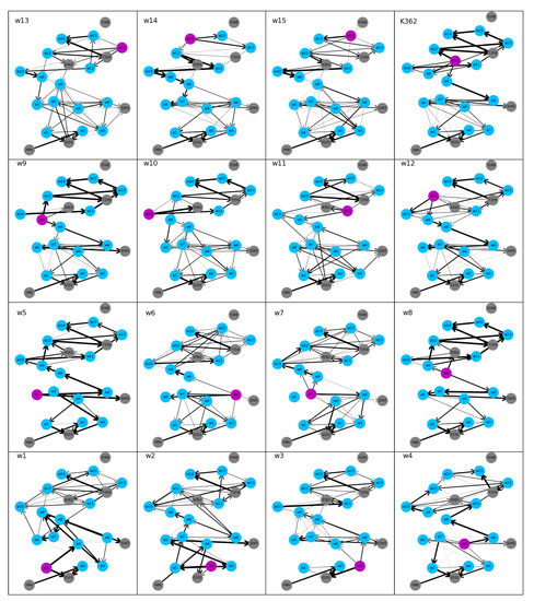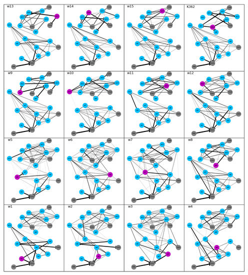 Directed hydrogen-bonded network computed from the MD simulations of “up” models with the excess proton located at different residues. The nodes of the network are the protein residues (in gray) Y288, T359, K362, S365, H96, or E101, and the fifteen water molecules (in blue) in the channel. The residue carrying the excess proton is highlighted in magenta. Edges of the network correspond to hydrogen bonds, shown as arrows pointing from donor to acceptor residue. The thickness of the lines indicate the probability of the hydrogen bonds. Hydrogen-bonded networks of models with protonated H96 and E101, respectively, are shown in Supplementary Figure S3.