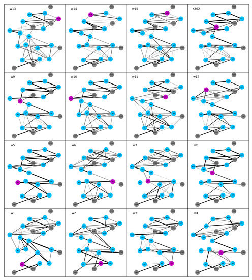 In the “down” models, Y288 is not connected to the rest of the hydrogen-bonded network or only with very low probability, in agreement with the low probability to observe a water molecule just below this residue (see Figure 2). All other residues are connected in both the undirected and the directed networks of the “down” model, albeit some with low probability (see Figure 6 and Figure 7, respectively). The connectivity, in terms of number of edges, of the undirected networks in the “down” models is generally lower than in the “up” models, in particular in the upper part of the networks (see Figure 4 and Figure 6, respectively).
